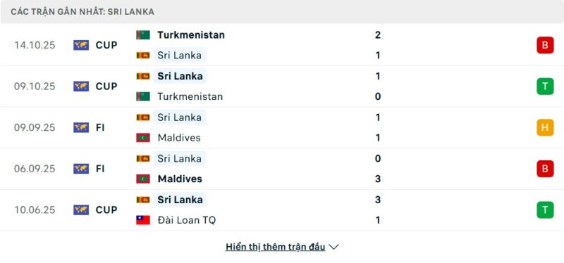 Sri Lanka bước vào trận đấu với phong độ khá ổn định trong khuôn khổ vòng loại. Họ đang xếp thứ ba bảng D với sáu điểm, thể hiện sự tiến bộ rõ rệt. Những chiến thắng trước Turkmenistan và Đài Bắc Trung Hoa cho thấy khả năng cạnh tranh của đội bóng này. Tuy nhiên, thất bại sát nút trước Thái Lan ở lượt đi cho thấy khoảng cách nhất định. Gần đây, họ cũng có kết quả hòa và thắng trong các trận giao hữu, chứng tỏ sự ổn định đáng khen ngợi.