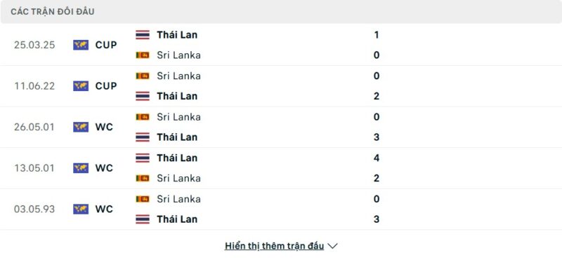 Thành tích đối đầu của Sri Lanka vs Thái Lan