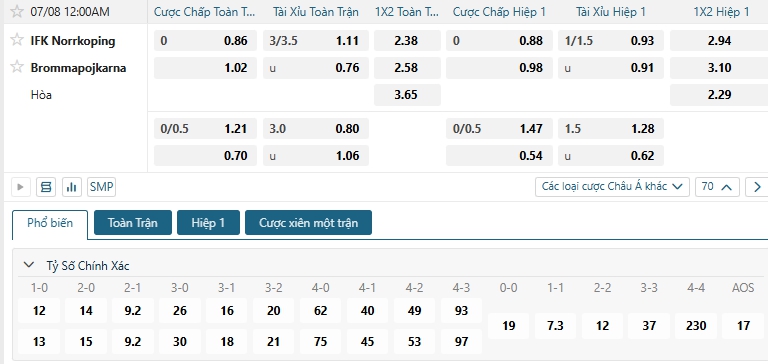 Tip kèo Châu Á hiệp 1 IFK Norrkoping vs Brommapojkarna