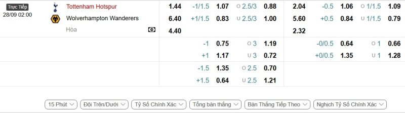Bảng Tỷ lệ kèo bóng đá Tottenham Hotspur vs Wolverhampton Wanderers