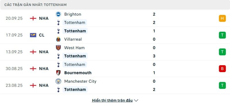 Tottenham Hotspur đang cho thấy sự khởi đầu khá tích cực ở mùa giải mới. Sau 5 vòng đấu, họ đã giành được 3 chiến thắng, 1 trận hòa và chỉ thua 1 lần, hiện xếp ở vị trí thứ 3 trên bảng xếp hạng với 10 điểm. Đáng chú ý là những chiến thắng quan trọng trước Man City và West Ham, đồng thời họ cũng giữ được sự chắc chắn khi đánh bại Villarreal tại Champions League. Mặc dù để mất điểm đáng tiếc trước Brighton, nhưng nhìn chung, đoàn quân của Thomas Frank vẫn duy trì được sự ổn định và thể hiện lối đá kỷ luật, hiệu quả cả trong phòng ngự lẫn tấn công.
