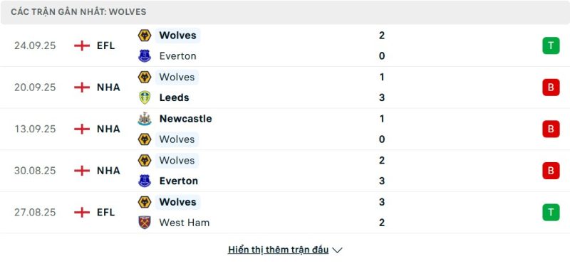 • Phong độ của Wolverhampton Wanderers