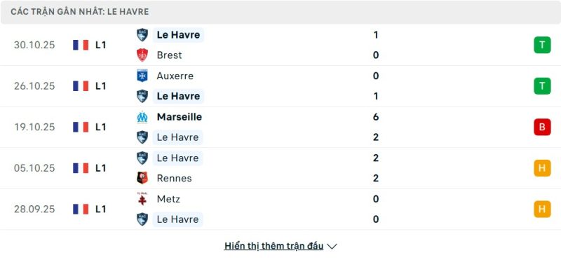 5 trận gần nhất của Le Havre: W-W-L-D-D