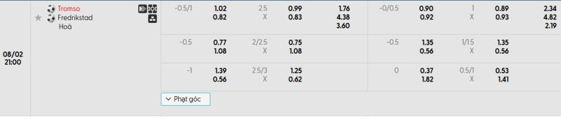 Bảng Tỷ lệ kèo bóng đá Tromsø vs Fredrikstad