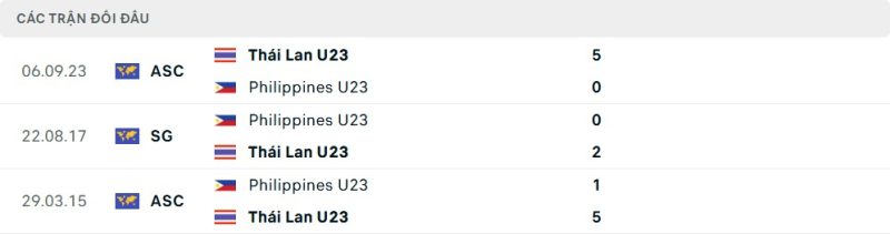 Thành tích đối đầu của U23 Philippines vs U23 Thái Lan