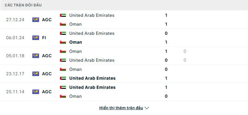 Thành tích đối đầu của UAE vs Oman