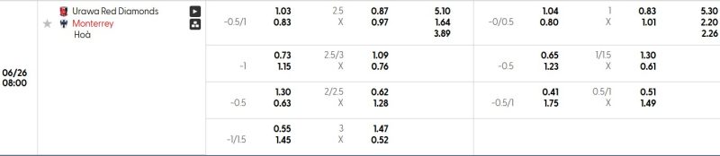 Bảng Tỷ lệ kèo bóng đá Urawa Red Diamonds vs Monterrey