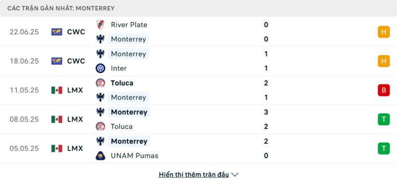 5 trận gần nhất của Monterrey: D-D-L-W-W