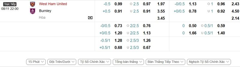 Bảng Tỷ lệ kèo bóng đá West Ham United vs Burnley