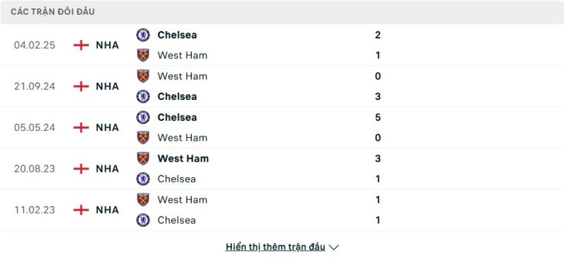 Thành tích đối đầu của West Ham United vs Chelsea